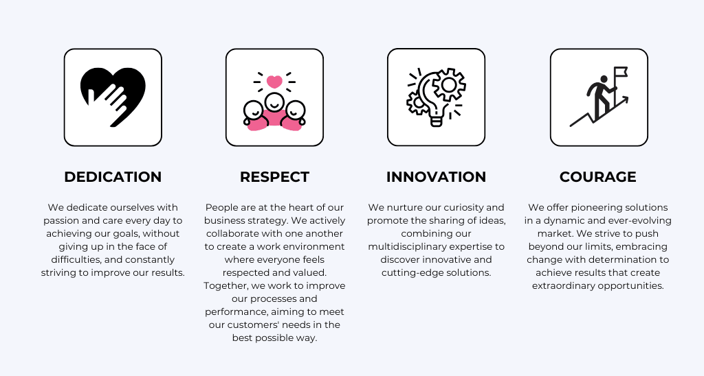 The values in which we believe characterize our behavior both within the company and toward our customers, suppliers and partners.